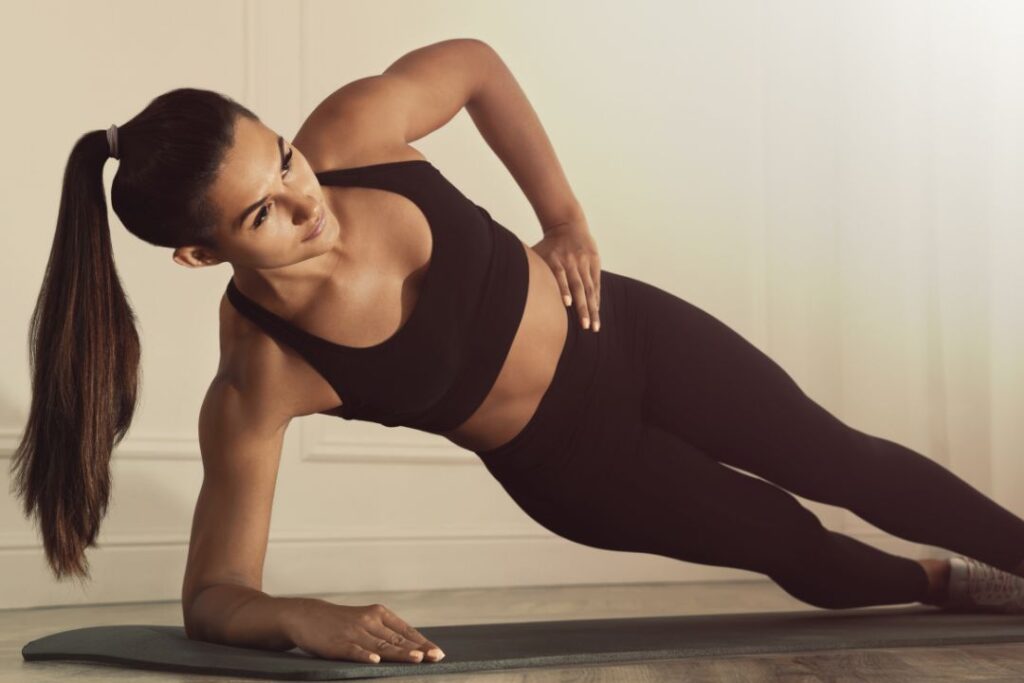 ・やり方: 横向きに寝て、下側の肘で体を支え、腰を持ち上げます。頭から足まで一直線にします。