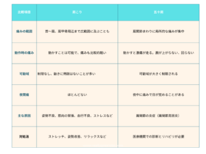 肩こりと五十肩の違いを、わかりやすく表にまとめました。